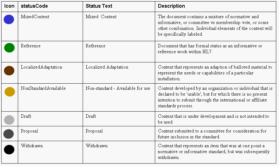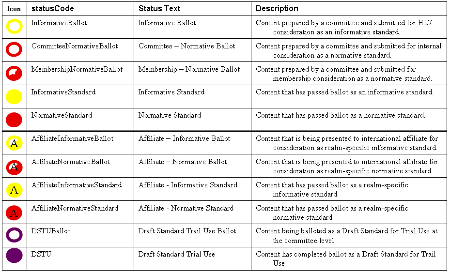 Yellow identifies an informative document. Informative documents are balloted according to a procedure outlined by HL7. While calling for consensus, the ballot procedure for informative documents is not as stringent as that for normative documents. Information documents are not submitted to ANSI for approval.