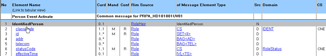 The R-MIM diagrams use the same conventions and notions that are used in the D-MIM diagrams. Please refer to that chapter for specific information about how to read these diagrams. There is however an additional level of documentation available for R-MIMs. An R-MIM now has clickable hyperlinks on each class in the R-MIM which link to a table view. This provides an easy way to reference any additional documentation which has been provided in the table view. |