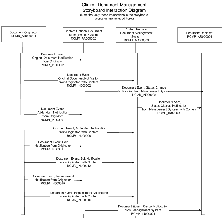 As the list above indicates, each interaction is related to a sending role, a receiving role (both of which were identified on the Interaction Diagram), a trigger event, and a message type. In the Version 3 specifications, the Interactions are presented with a name, the artifact ID, and a table that lists the sending role, the receiving role, the trigger event, the message type, the Event type and the Wrapper type. |